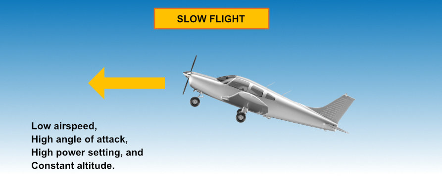 While pilots typically perform these operations at low airspeeds and close to the ground, pilots learn to maneuver an airplane in slow flight at a safe altitude.